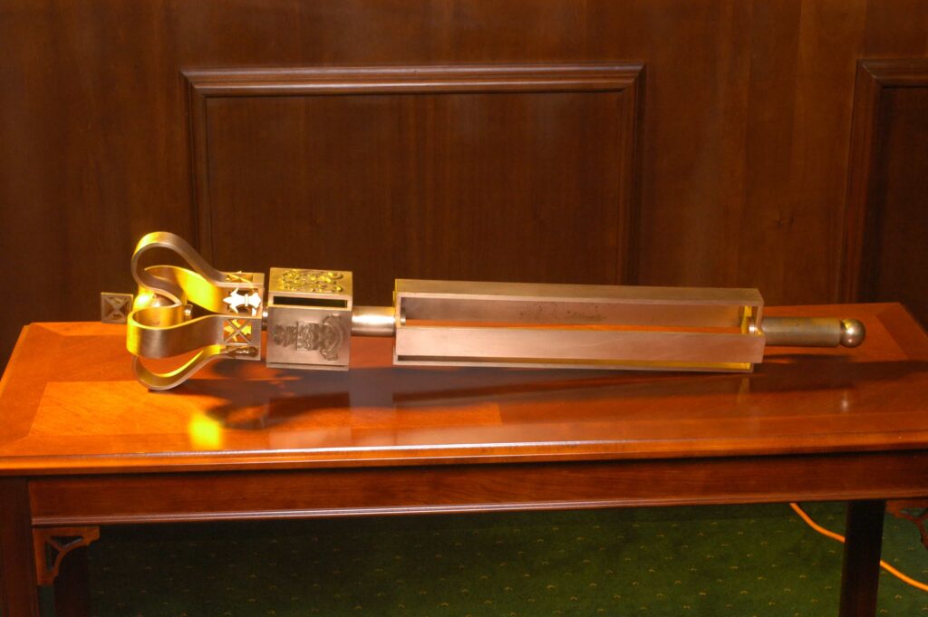The Mace was presented to the Legislative Assembly on Wednesday 20 November 1974 by the Bank of Nova Scotia and the Bank of Nova Scotia Trust Company (Cayman) Limited at a cost of approximately $1,960. The top of the Mace features an orb and a Maltese cross inlaid with turtle shell. Other symbols at the top are the Royal Arms, the Cayman Islands Crest, and the inscription ‘EIIR’, symbolizing Regina (Queen) Elizabeth II. In 2003 the Mace underwent restoration work that was carried out locally by Tropical Metals. The work entailed dissembling the multi-faceted item, cleaning each piece, applying a metal-treatment finish, and final reassembly.
